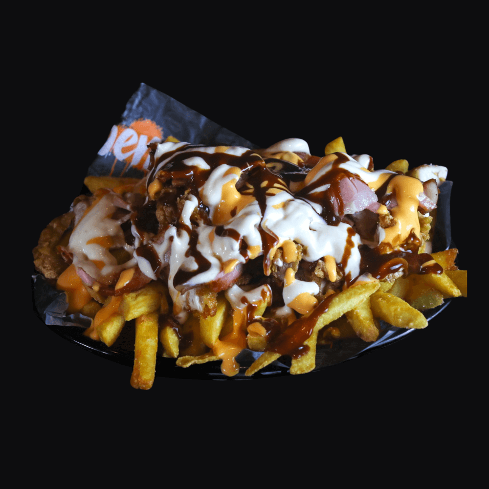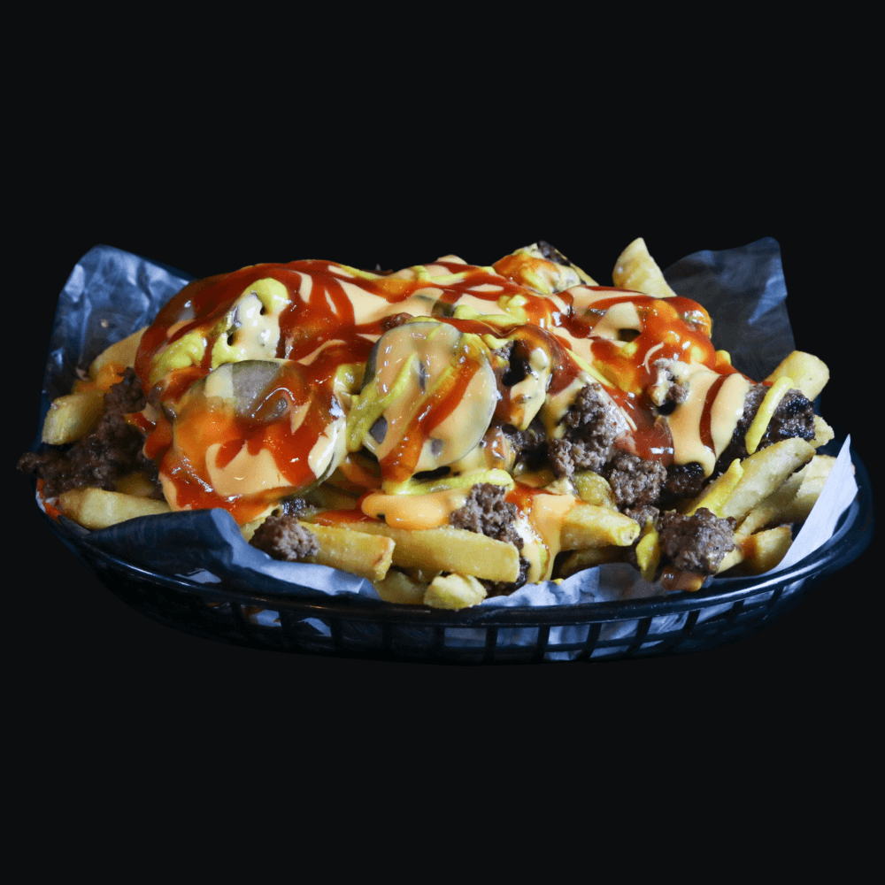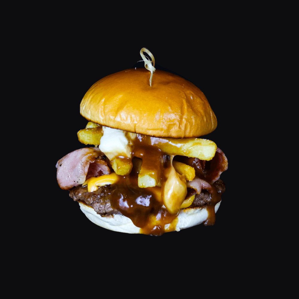 Beef patty, cheese, bacon, salted fries, gravy, melted cheese curds.