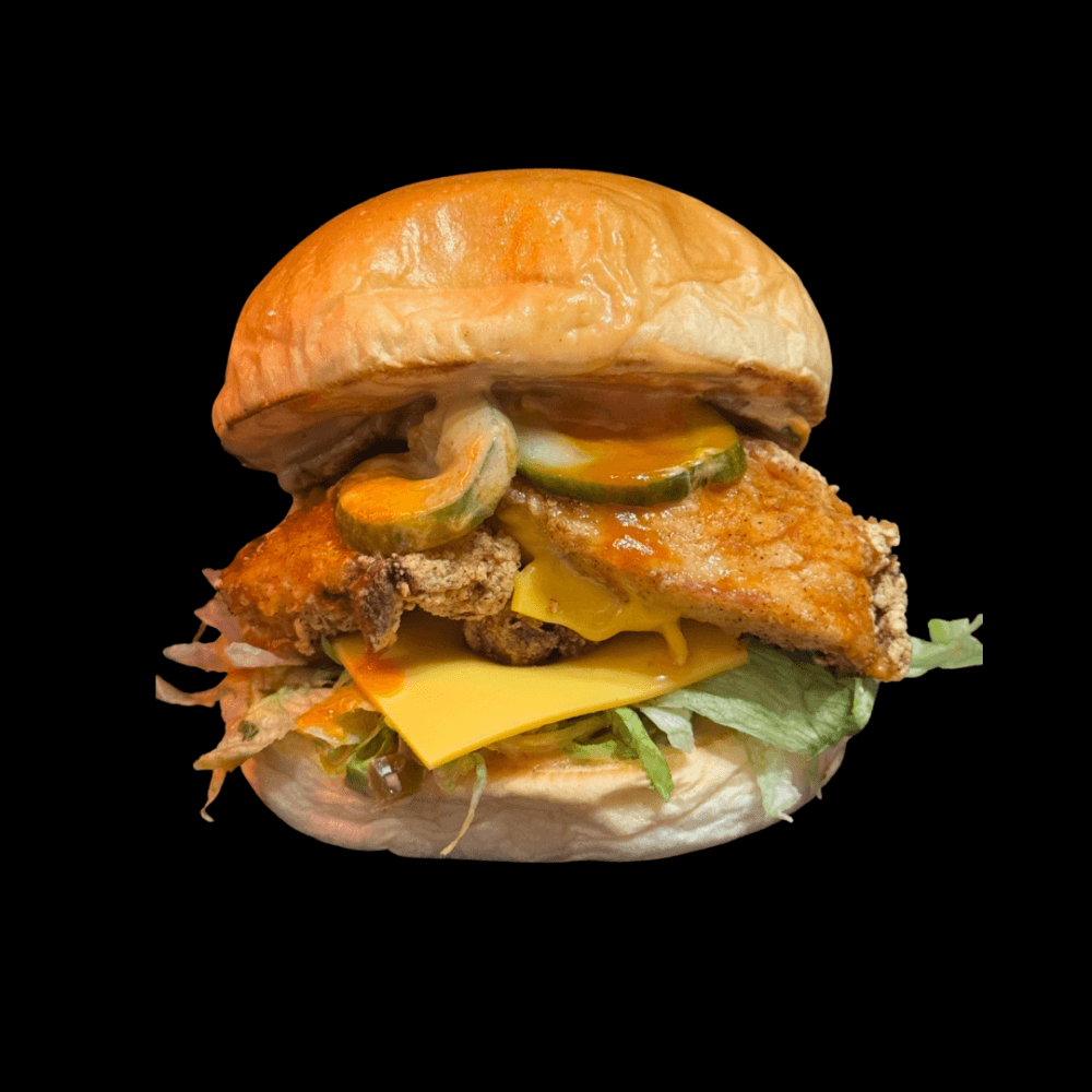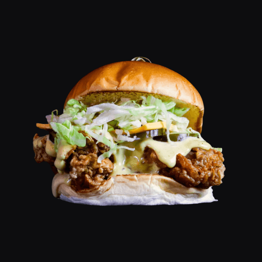 Fried chicken, special sauce, cheese, pickles, onions, shredded iceberg lettuce.