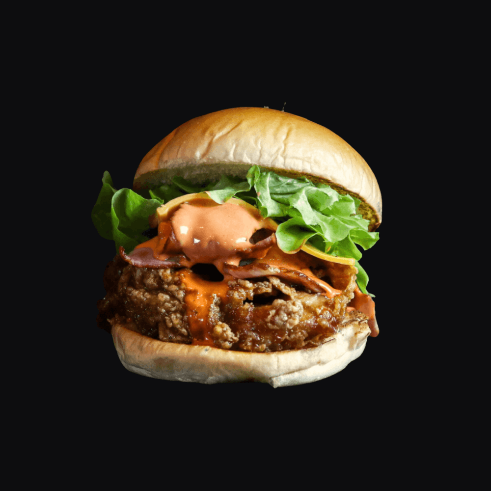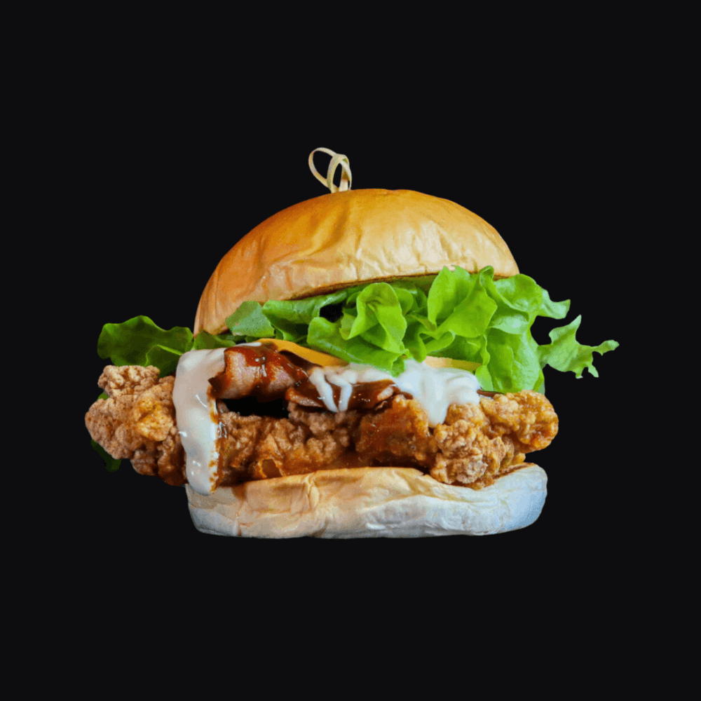 Brisbane's best fried chicken burger, wild turkey-maple glazed fried chicken, bacon, cheese, lettuce & Frank's Mayo