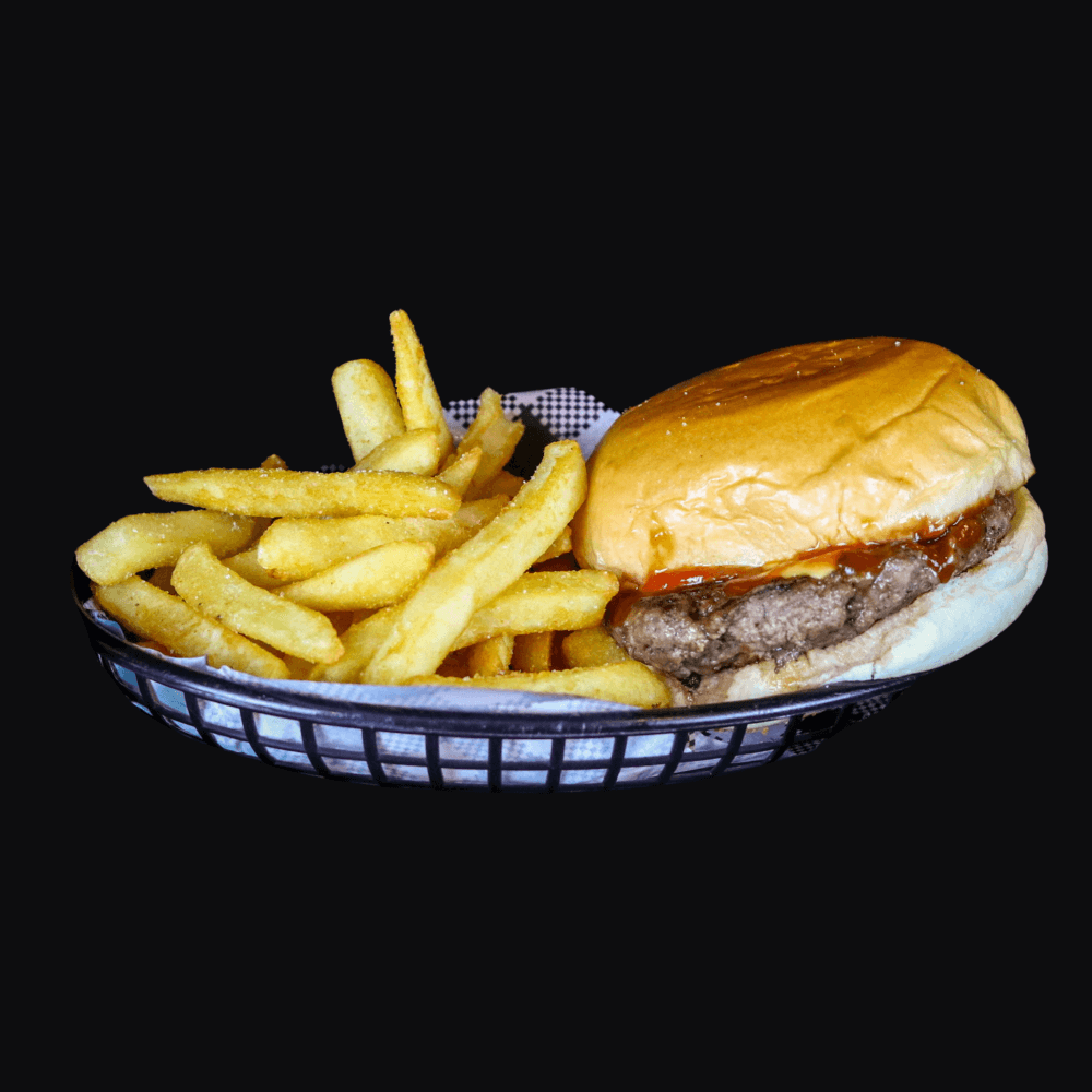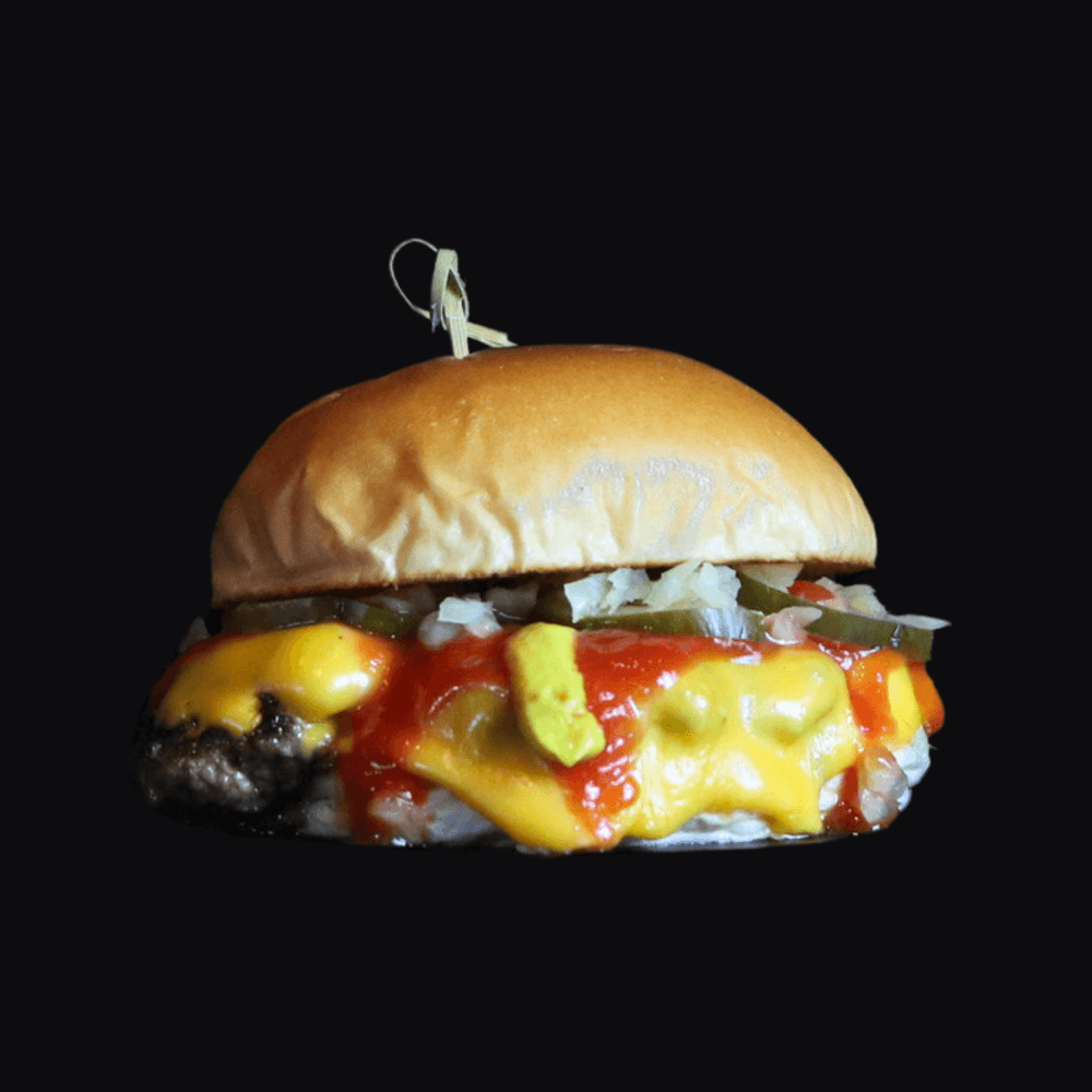 Benz beef patty, double cheese, house pickles, sour onion, ketchup & mustard